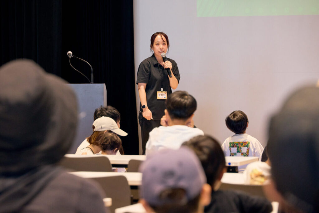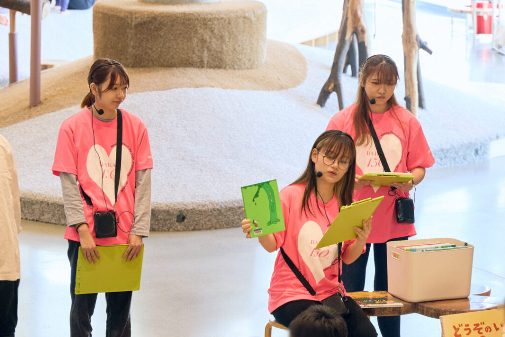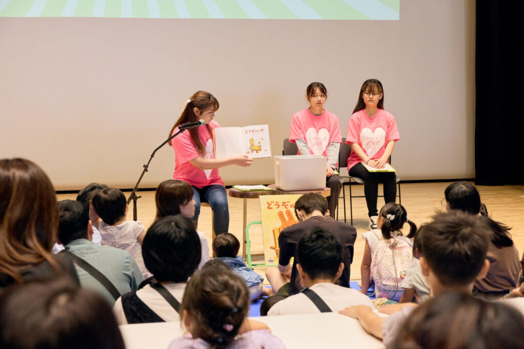 続いて、梅花女子大学の学生による「木の絵本読み聞かせ」では、やさしい語りと木の香りが会場を包み、子どもたちも真剣な表情で聞き入っていました。