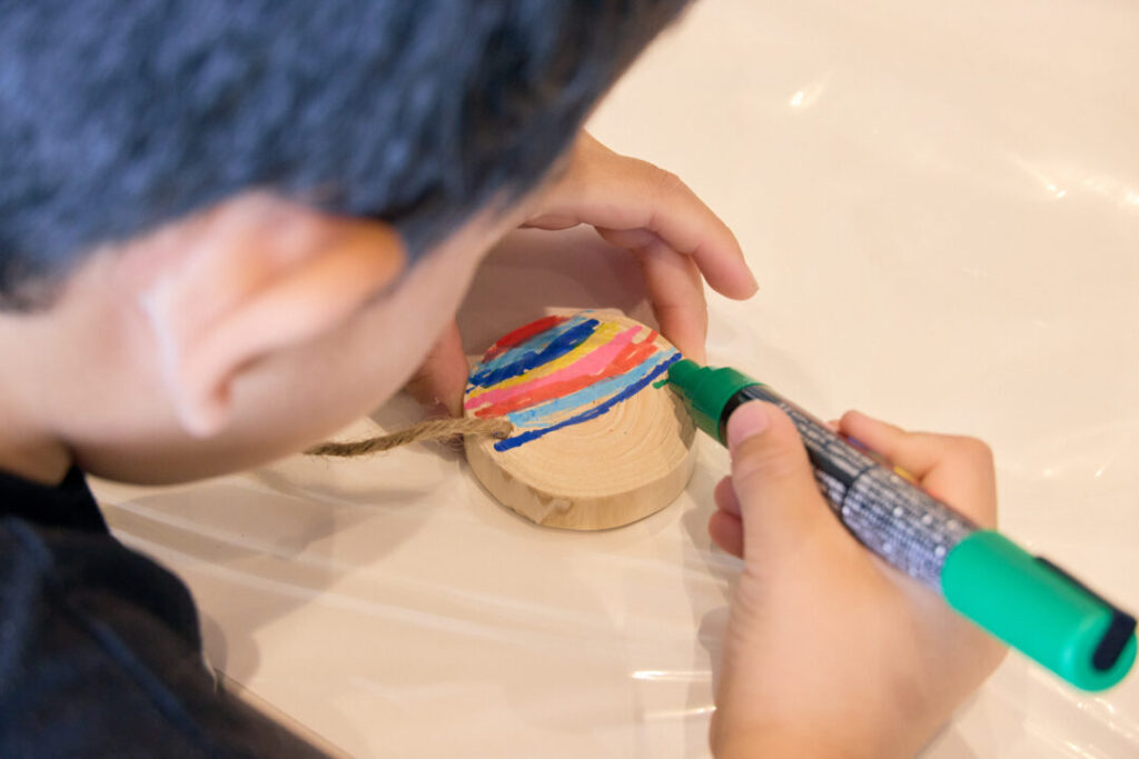 Dreamdoor夢羽舎による時計作り、アルトデザインによる「いばらき童子」スタンプコースターづくり。そして里山センターによる「カスタネット&木のキーホルダーづくり」では、色を塗ったり、紐を通したりと子どもたちの自由な発想が光りました。