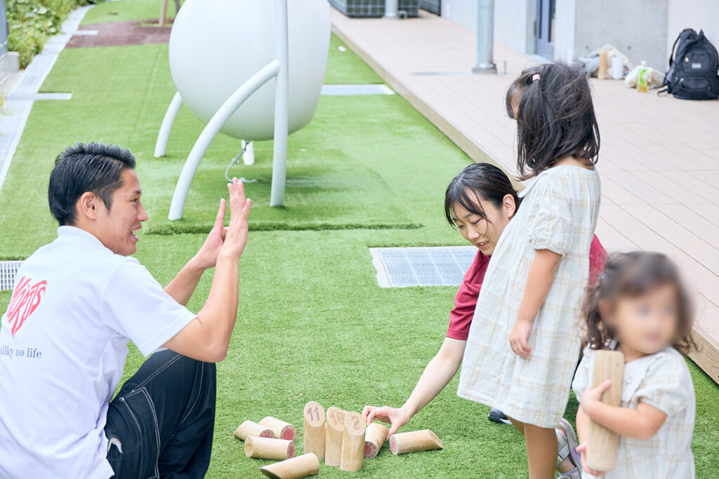 青空の下では、立命館OICモルックサークル Möritsと、株式会社ジャクエツによる「モルック体験」が開催され、初めて挑戦する子どもたちの笑い声が広場いっぱいに広がりました。