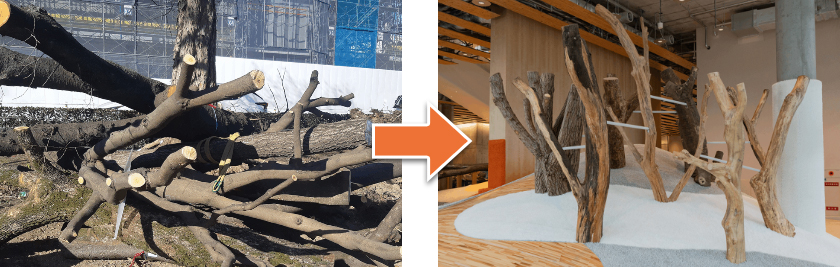 もっくるでは、茨木市内で安全上の理由などから伐採された木々を、茨木市は一本ずつ丁寧に保管・管理し、安全性を確認したうえで、遊具や什器として再活用しています。